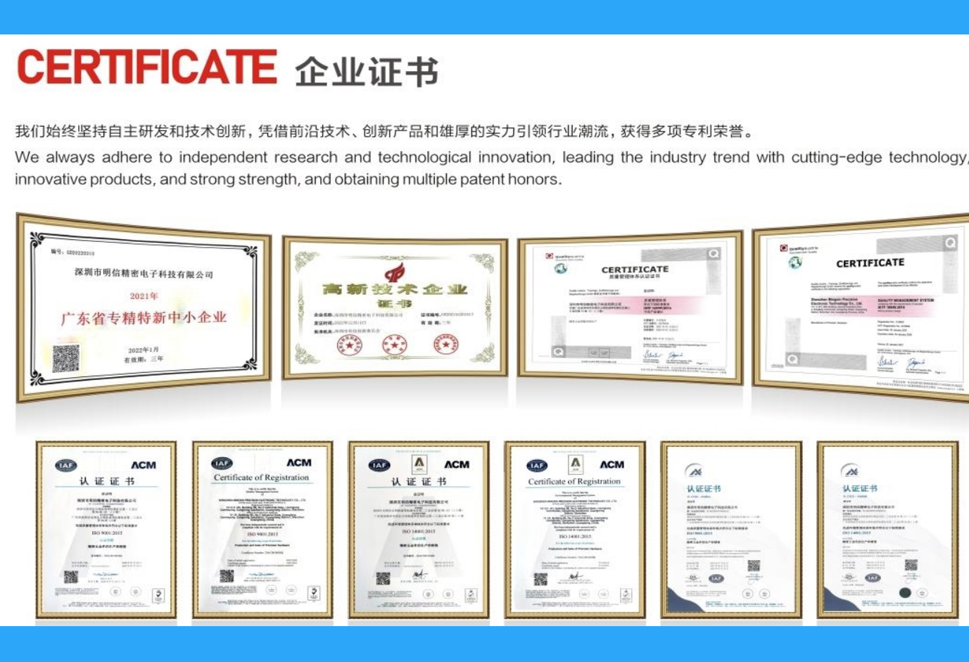 learn more明信精密创建于2008年,位置于深圳市光明区公明镇。近年来公司快速发展,于2021年在惠州市仲恺高新区中集产业园投资购买一栋现代化工业厂房。如今工厂面积18000多平方米,员工300多人。拥有一支勇于拼博、敢于创新的生产团队,是技术领先的专业精密连接器金属件供应商。专业从事通讯设备、医疗设备、军工设备、轨道交通、航空航天、新能源汽车领域的连接器精密五金产品制造。 公司已通过IATF16949汽车质量管理体系认证、SO9001质量管理体系认证、...learn more