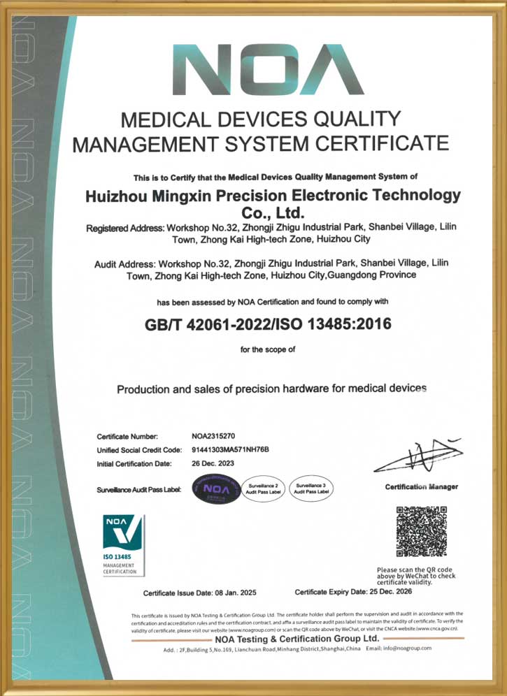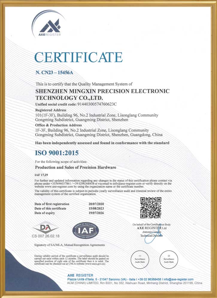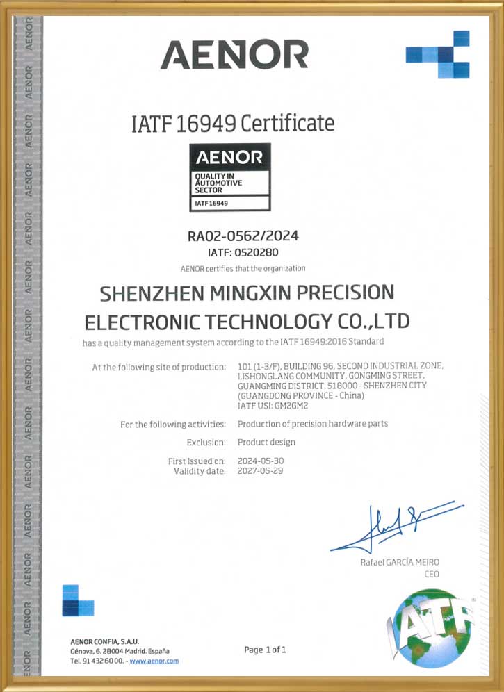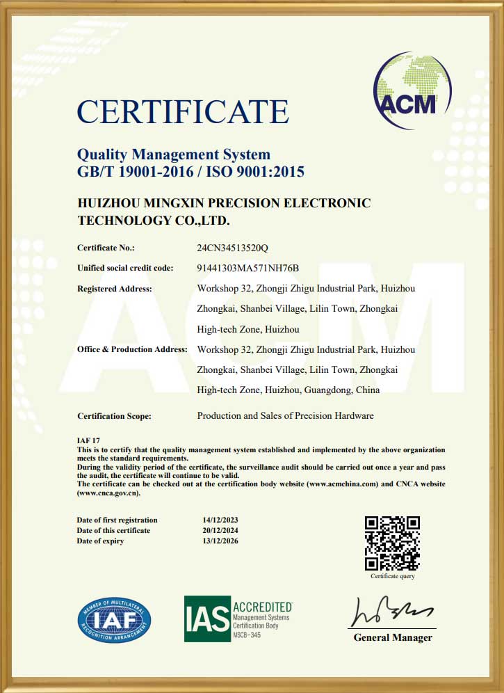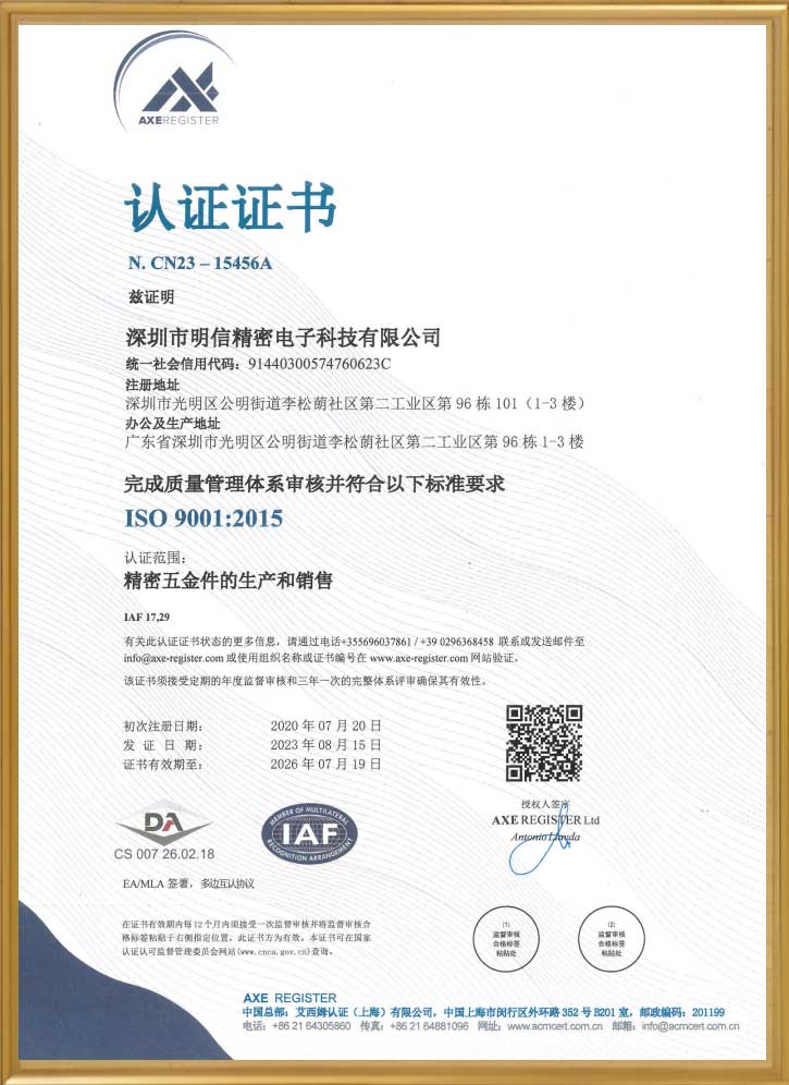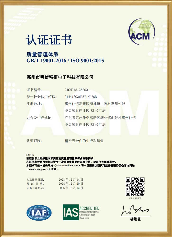 明信精密创建于2008年,位置于深圳市光明区公明镇。近年来公司快速发展,于2021年在惠州市仲恺高新区中集产业园投资购买一栋现代化工业厂房。如今工厂面积18000多平方米、员工300多人。拥有一支勇于拼博、敢于创新的生产团队,是技术领先的专业精密连接器金属件供应商。专业从事通讯设备、医疗设备、军工设备、轨道交通、航空航天、新能源汽车领域的连接器精密五金产品制造。公司已通过IATF16949汽车质量管理体系认证、S09001质量管理体系认证、IS014001环境管理体系认证。获得高新技术证书,以及国家专精特新证书并申请了多项专利证书。